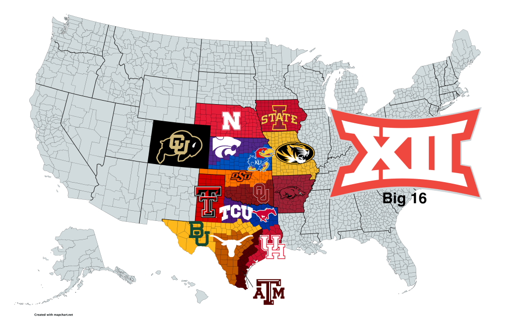 This list of teams makes so much geographical sense, as well as bringing back old rivalries. I wanted to keep the core of the Big 12 while adding teams that used to be in the Big 12. Nebraska reignites rivalries with Colorado, Kansas, Kansas State, Missouri, Oklahoma, and Texas. Missouri brings back rivalries with Arkansas, Kansas, Iowa State, and Oklahoma. Texas A&M would renew rivalries with Texas, Texas Tech, TCU, and Baylor, and the Arkansas-Texas rivalry also will begin again.