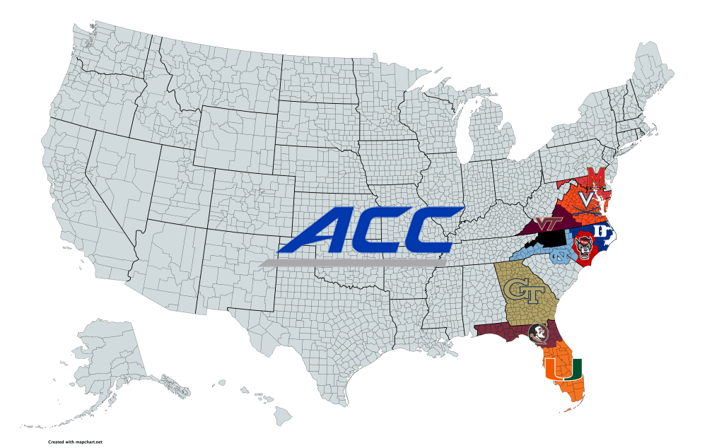 I wanted to keep the Tobacco Road teams together, the Commonwealth Cup teams (Virginia and Virginia Tech), bring Maryland back to the ACC (where they belong), and add football schools in Miami and Florida State. The one that wasn’t as much of a fit was Georgia Tech, playing in the ACC since 1978. There’s only one rival they could be playing, which is Virginia Tech. However, the ACC would probably like GT in because of the Atlanta market.