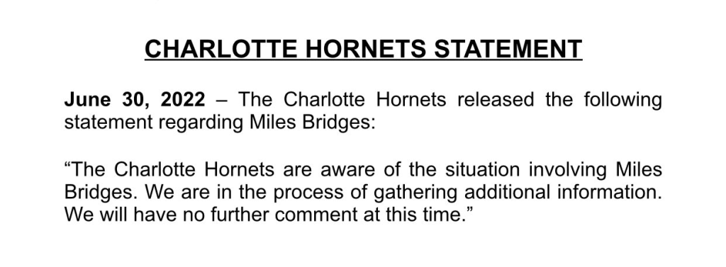 It happened Wednesday afternoon, but Miles Bridges was arrested and booked on a felony domestic violence warrant. TMZ broke the news first. He was released later that day on a $130,000 bond. Through their Public Relations (PR) Twitter account, the Hornets released a statement on the matter: